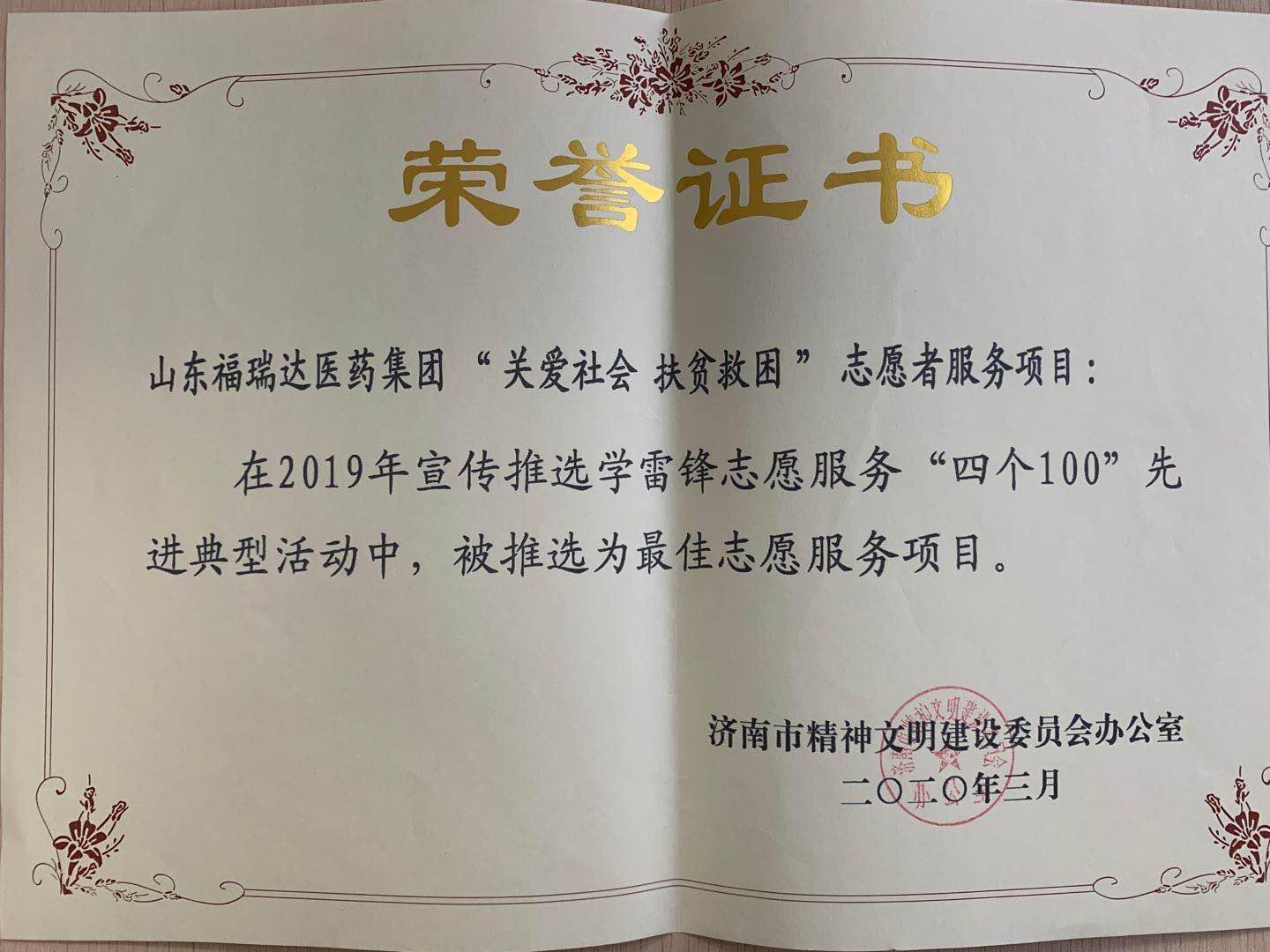 近期,福瑞達(dá)“關(guān)愛社會、扶貧救困”志愿服務(wù)項目在2019年度宣傳推選學(xué)雷鋒志愿服務(wù)“四個100”先進(jìn)典型中,被推選為“濟(jì)南市最佳志愿服務(wù)項目”。