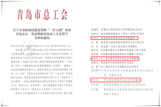 近日,青島市總工會公布職業(yè)技能競賽和“一匠五創(chuàng)”活動青島市五一勞動獎和青島市工人先鋒號名單,青島酒店學(xué)院張桂鳳、任傳生、王慶泉3名教師榮獲青島市五一勞動獎?wù)隆?/span>