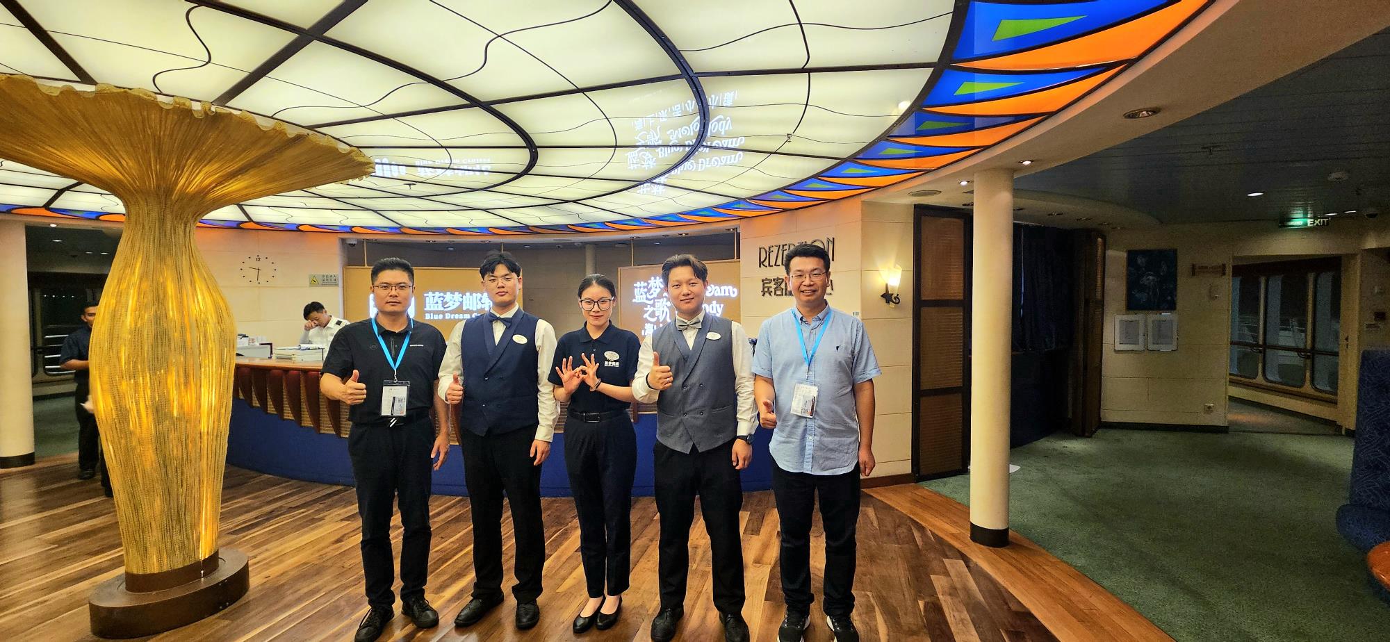 活動期間,學校教師還走訪看望了13名在郵輪實習、就業以及大會志愿服務的學生,并同“藍夢之歌”號負責郵輪運營服務的管理人員開展座談交流,征求工作建議,船方高級管理人員對我校學生的整體工作表現給予廣泛好評。