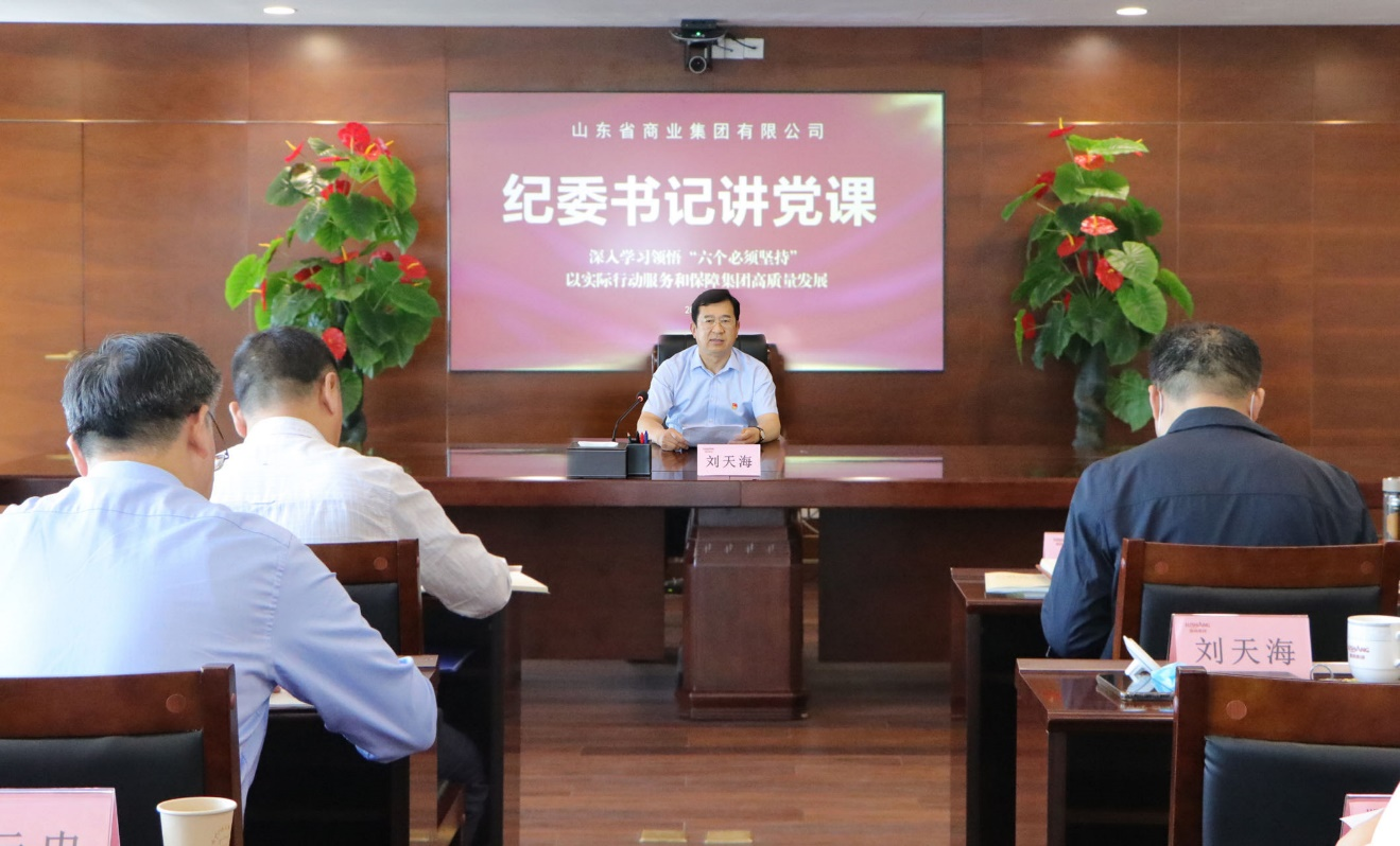 為扎實(shí)開(kāi)展學(xué)習(xí)貫徹習(xí)近平新時(shí)代中國(guó)特色社會(huì)主義思想主題教育,6月5日,魯商集團(tuán)黨委常委、紀(jì)委書(shū)記、省監(jiān)委駐集團(tuán)監(jiān)察專員劉天海圍繞“深入學(xué)習(xí)領(lǐng)悟‘六個(gè)必須堅(jiān)持’ 以實(shí)際行動(dòng)服務(wù)和保障集團(tuán)高質(zhì)量發(fā)展”為集團(tuán)黨員干部講專題黨課。集團(tuán)黨委書(shū)記、董事長(zhǎng)王緒超,黨委副書(shū)記、董事劉守亮,黨委副書(shū)記、董事、副總經(jīng)理朱華建,黨委常委、董事、總審計(jì)師、工會(huì)主席劉德華參加,黨委常委、董事、組織人力資源部部長(zhǎng)李林主持。
