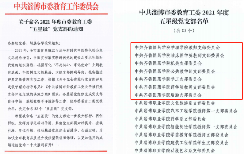 近日,淄博市委教育工委發(fā)布《關(guān)于命名2021年度市教育工委“五星級”黨支部的通知》,齊魯醫(yī)藥學院護理學院教師黨支部、臨床醫(yī)學院教師黨支部、機關(guān)黨支部、公共教學部黨支部、學工黨支部、藥學院教師黨支部、后勤黨支部7個黨支部獲評“五星級”黨支部。