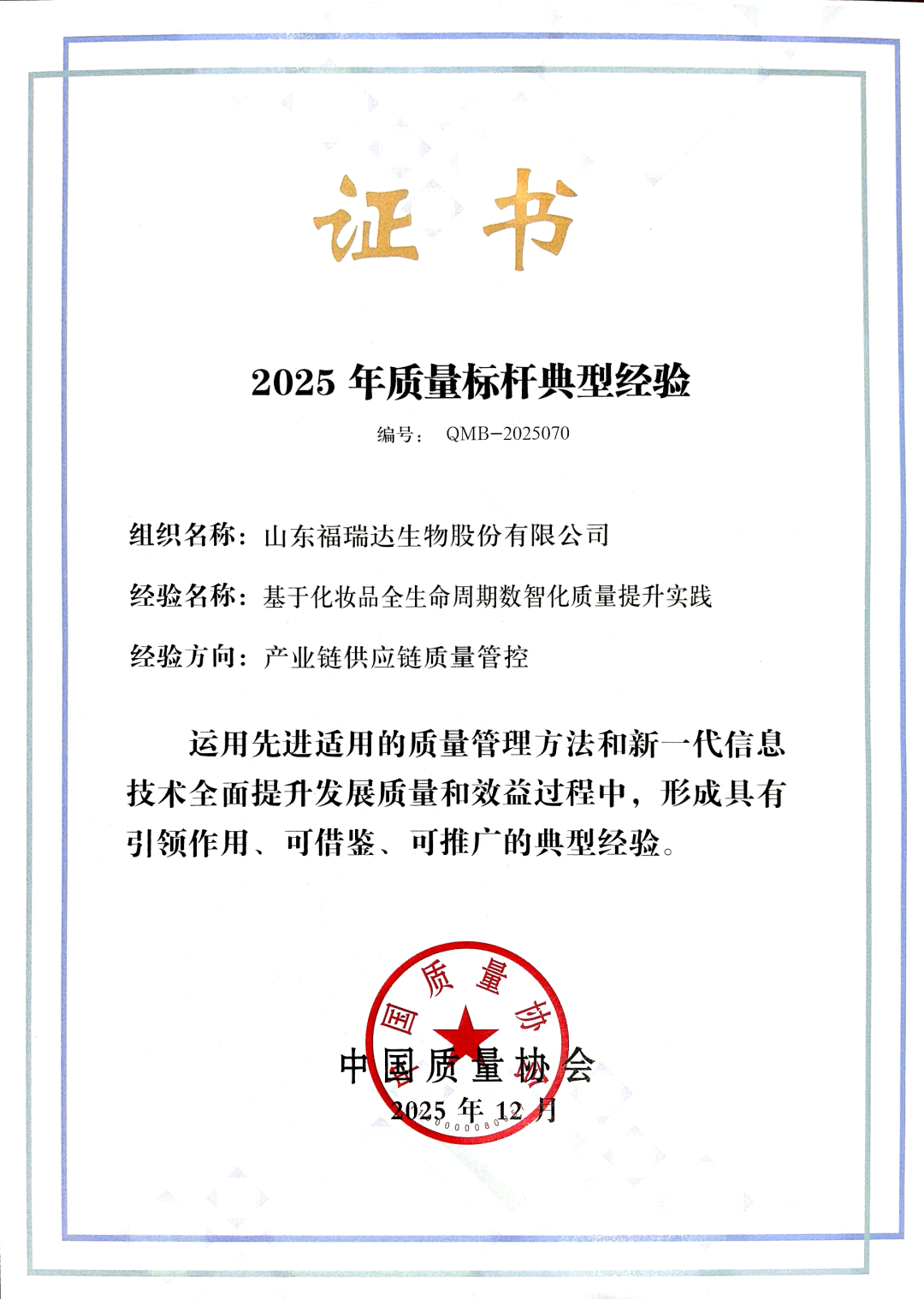 為助力培育產品卓越、品牌卓著、創(chuàng)新領先、治理現代的世界一流企業(yè),2025年中國質量協(xié)會持續(xù)開展質量標桿典型經驗征集與交流活動。活動嚴格遵循《質量標桿典型經驗征集管理辦法》,經過多輪嚴格篩選,最終從質量管理數字化、質量管理模式變革、質量管理推進機制建立、產業(yè)鏈供應鏈質量管控等多個關鍵領域,評選出74項具有示范引領作用的典型經驗,福瑞達生物股份的實踐經驗在產業(yè)鏈供應鏈質量管控方向脫穎而出。