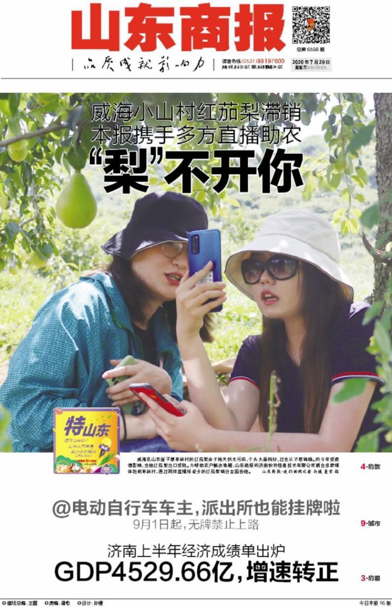 公益助農齊魯行,為愛下單“特山東”。山東商報傾力為扎根齊魯大地的“鄉村好品”代言,為打造鄉村振興的齊魯樣板助力。在由各種平臺得知農戶求助信息并溝通核實后,報社會派出“文字+直播團隊”,利用多個報道和銷售平臺啟動公益助農活動?;顒有问匠恕皫ж浿辈ァ保€包括報紙報道、將產品上架山東商報官方微店等,多管齊下,凸顯合力,為滯銷農產品打開銷路。