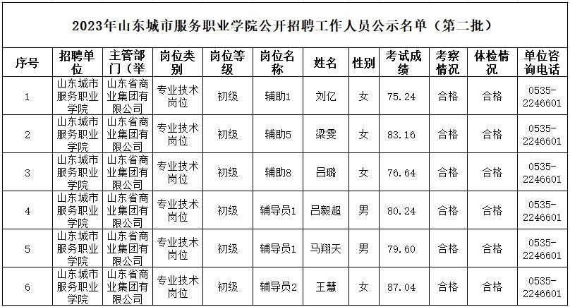 山東城市服務職業學院2023年公開招聘擬聘用人員公示名單(第二批)